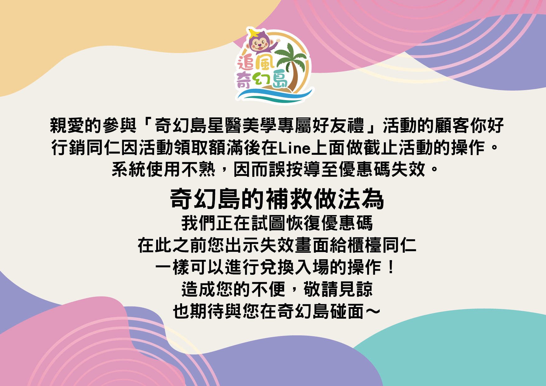 親愛的參與「奇幻島星醫美學專屬好友禮」活動的顧客你好,行銷同仁因活動領取額滿後在Line上面做截止活動的操作。系統使用不熟,因而誤按導致優惠碼失效。