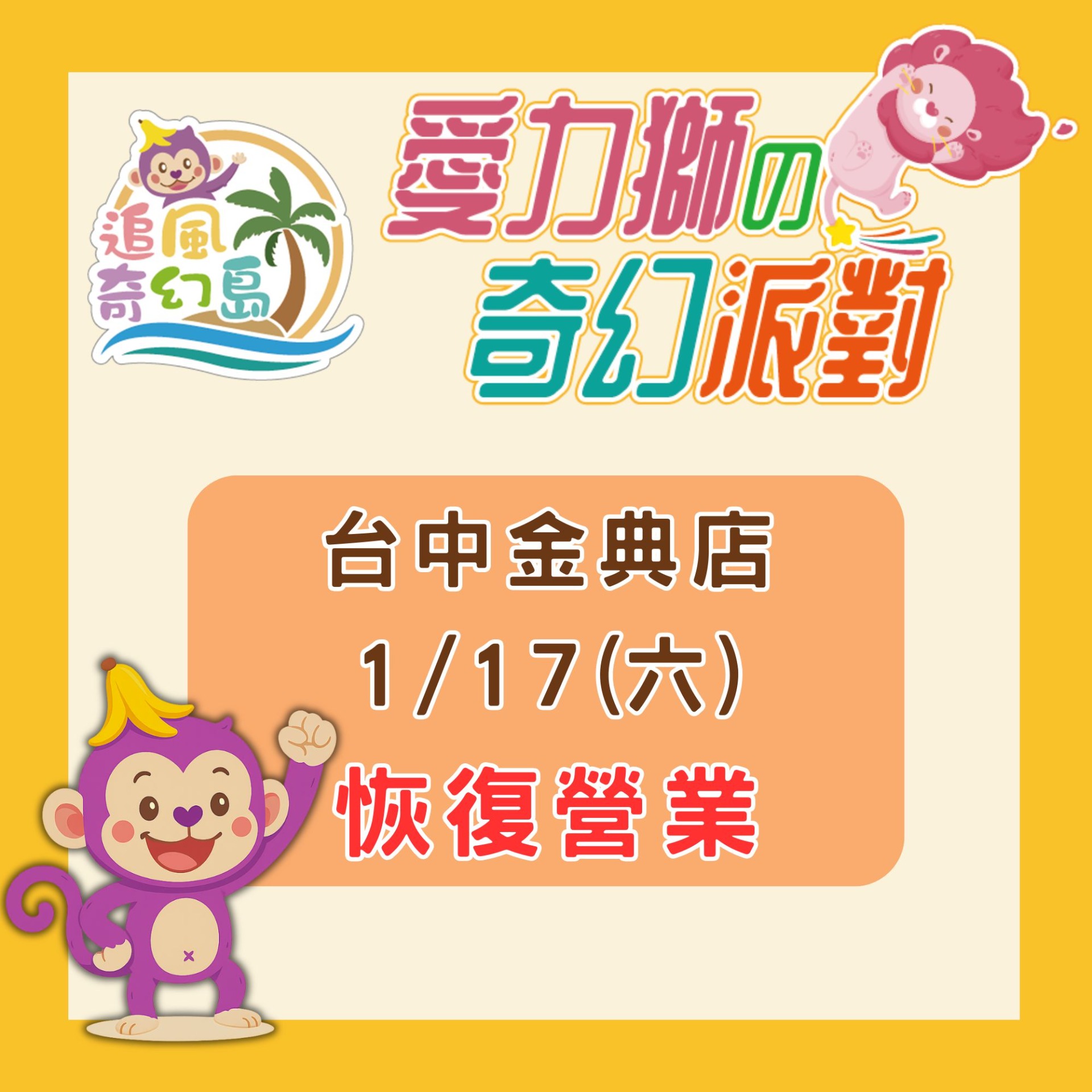 台中金典綠園道店 - 愛力獅奇幻派對 1/17(六)恢復營業!!!